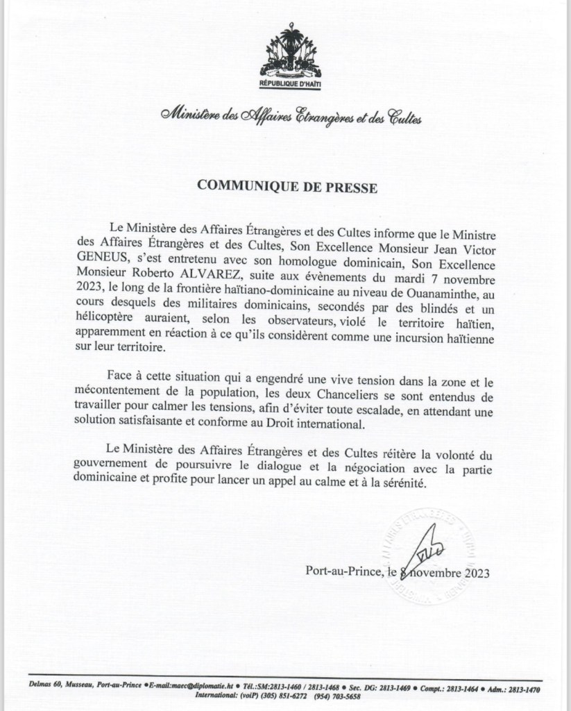 Dans un communiqué de presse du Ministère des Affaires Étrangères et des Cultes, il est annoncé que le Ministre des Affaires Étrangères et des Cultes d’Haïti, Son Excellence Monsieur Jean Victor GENEUS, a eu une réunion avec son homologue dominicain, Son Excellence Monsieur Roberto ALVAREZ, en réponse aux récents événements survenus le mardi 7 novembre 2023 le long de la frontière haïtiano-dominicaine, à Ouanaminthe. Selon des observateurs, des militaires dominicains, appuyés par des véhicules blindés et un hélicoptère, auraient apparemment franchi la frontière haïtienne, en réaction à ce qu’ils perçoivent comme une incursion haïtienne sur leur territoire.