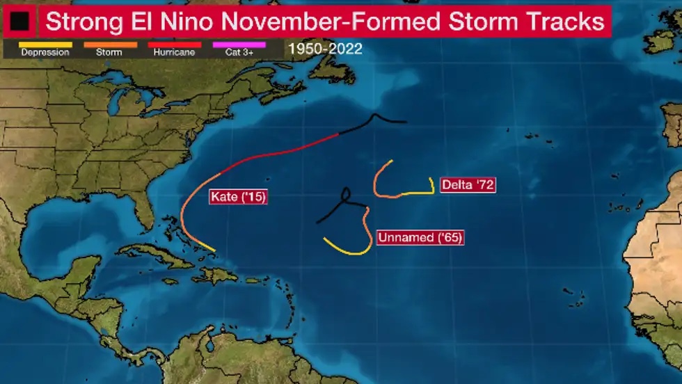 Enregistrées depuis 1950, seulement trois systèmes sont devenus des dépressions ou des tempêtes en novembre lors d’un El Niño puissant dans le bassin atlantique. Aucun de ces systèmes, comme le montre la carte des trajectoires ci-dessous, ne l’a fait dans la mer des Caraïbes. Pourquoi cela pourrait-il représenter une première dans l’Atlantique tropical depuis au moins 73 ans?