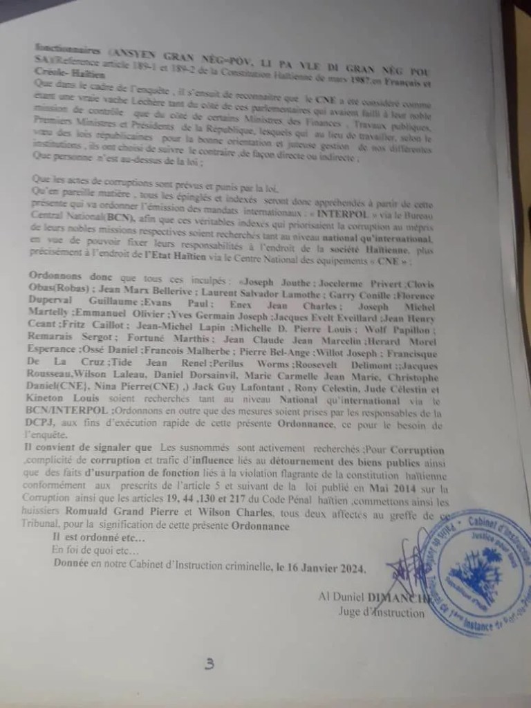 L’ordonnance aux fins d’exécution des mandats internationaux souligne les efforts concertés de la justice haïtienne pour traduire en justice ceux qui ont abusé de leur pouvoir et ont été impliqués dans des pratiques corrompues. La liste des personnalités politiques de haut niveau impliquées renforce l’importance accordée à la lutte contre la corruption au sein du pays.