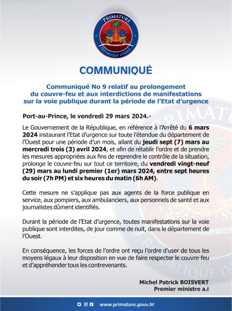 Port-au-Prince, le 29 mars 2024.- Le Gouvernement de la République, en référence à l’Arrêté du 6 mars 2024 instaurant l’Etat d’urgence sur toute l’étendue du département de l’Ouest pour une période d’un mois, allant du jeudi sept (7) mars au mercredi trois (3) avril 2024, et afin de rétablir l’ordre et de prendre les mesures appropriées aux fins de reprendre le contrôle de la situation, prolonge le couvre-feu sur tout ce territoire, du vendredi vingt-neuf (29) mars au lundi premier (1er) avril 2024, entre sept heures du soir (7h PM) et six heures du matin (6h AM).