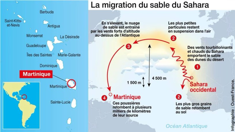 Les Caraïbes sont actuellement sous l’influence des brumes de sable du Sahara et du Sahel, transportées par les alizés jusqu’aux îles de l’arc antillais. Ce phénomène, bien que naturel, pose un risque pour les personnes vulnérables en raison de la finesse des particules qui peuvent pénétrer profondément dans les voies respiratoires. Selon les météorologues, les conditions favorables à la propagation de ces poussières s’intensifient typiquement entre avril et octobre, période où la chaleur du désert est à son apogée.