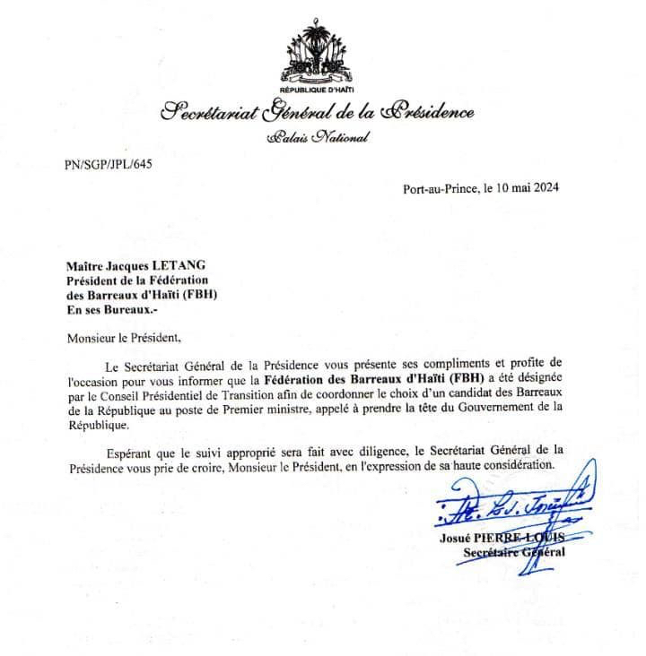 Dans une correspondance datée du 10 mai 2024, le Secrétariat Général de la Présidence a notifié à Maitre Jacques LETANG, Président de la Fédération des Barreaux d’Haïti (FBH), que celle-ci avait été choisie par le Conseil Présidentiel de Transition pour superviser la nomination d’un candidat des Barreaux de la République au poste de Premier ministre. Cette décision est cruciale dans le cadre de la formation du prochain gouvernement de la République d’Haïti.