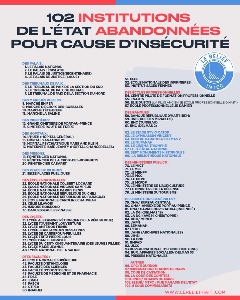 Selon des données compilées par des organisations locales et des rapports internationaux, plus de 100 institutions étatiques haïtiennes ont été contraintes d’abandonner leurs locaux depuis 2023 en raison de l’insécurité grandissante. Ce phénomène, qui s’intensifie depuis plusieurs mois, soulève des interrogations sur la capacité des autorités à rétablir l’ordre public, dans un contexte de crise multidimensionnelle.